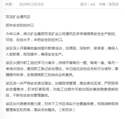 《中国煤炭报》:淮北矿业集团双龙矿业通风区把牢安全防控关口