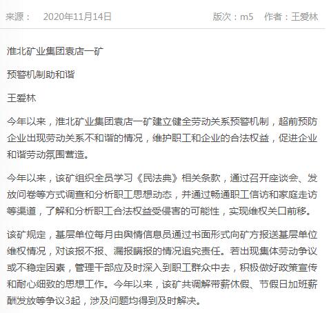 《中国煤炭报》:淮北矿业集团袁店一矿预警机制助和谐