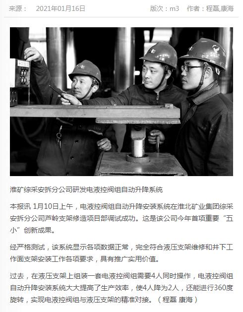 《中国煤炭报》:淮北矿业集团综采安拆分公司研发电液控阀组自动升降系统