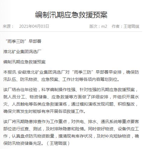 《中国煤炭报》:淮北矿业集团涡选厂编制汛期应急救援预案