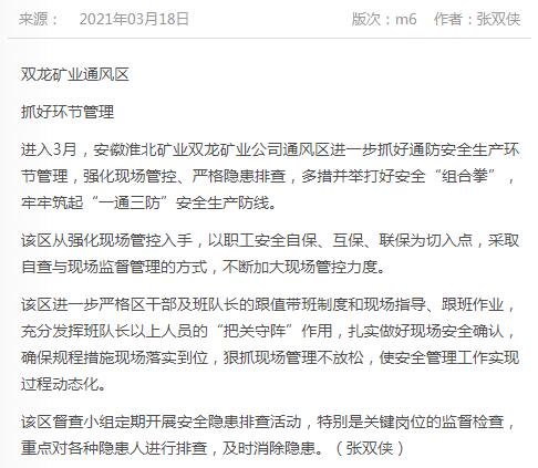 《中国煤炭报》:淮北矿业集团双龙矿业通风区抓好环节管理