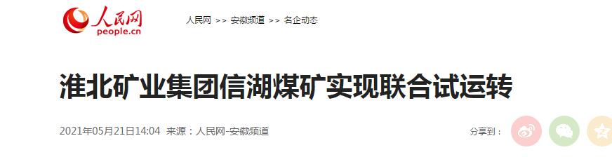 5月18日,淮北矿业集团信湖煤矿顺利实现联合试运转,每年可为集团新增300万吨优质煤炭资源。这是该集团进入“十四五”建成的首批重点工程项目。