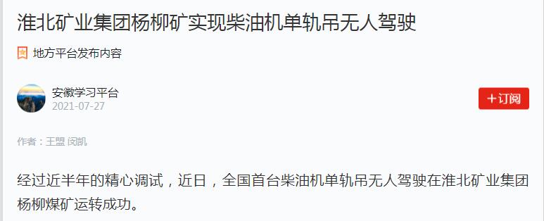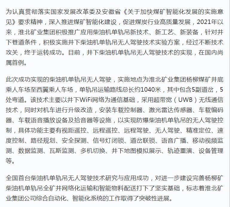 《学习强国》:淮北矿业集团杨柳矿实现柴油机单轨吊无人驾驶